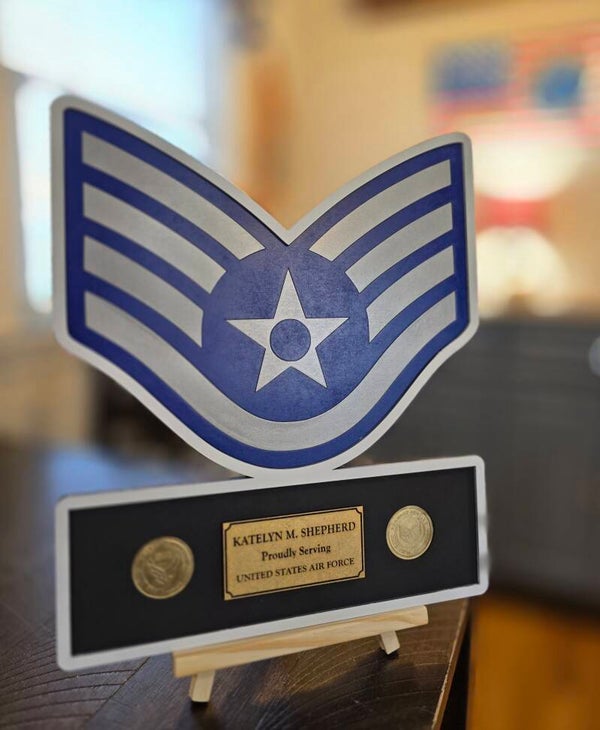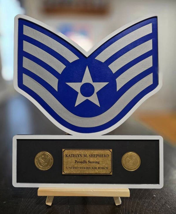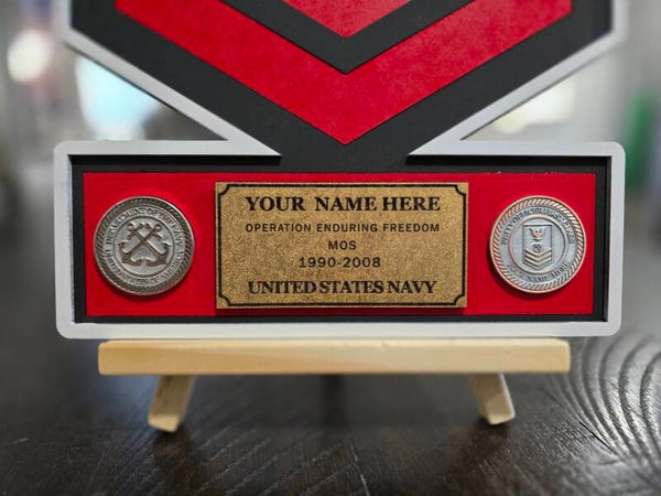 Proudly display you or a loved one's dedication to country with these custom Armed Forces rank signs. The signs are approximatly 14x11 inches, and include 2 custom challenge coins. These quality coins are made from solid brass and buffed to nice sheen. You can also choose a weathered bronze look instead of the brass depending on your personal taste. Made from three layers of stable tempered hardboard, these signs will never warp , crack or cup like natural wood. The signs come with a saw tooth hanger affixed to the back, but can also be displayed on a desk or shelf.